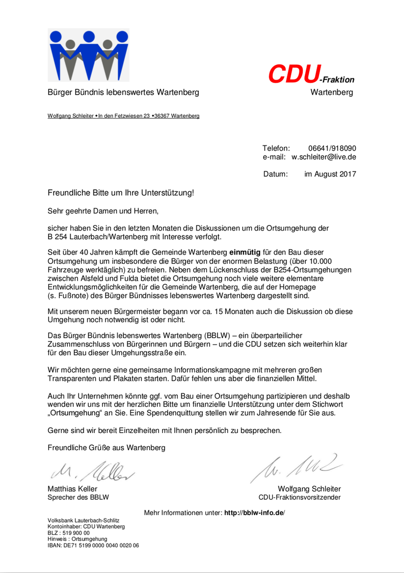 Aktion „Besser für Wartenberg“ wird unterstützt von der CDU-Fraktion Wartenberg